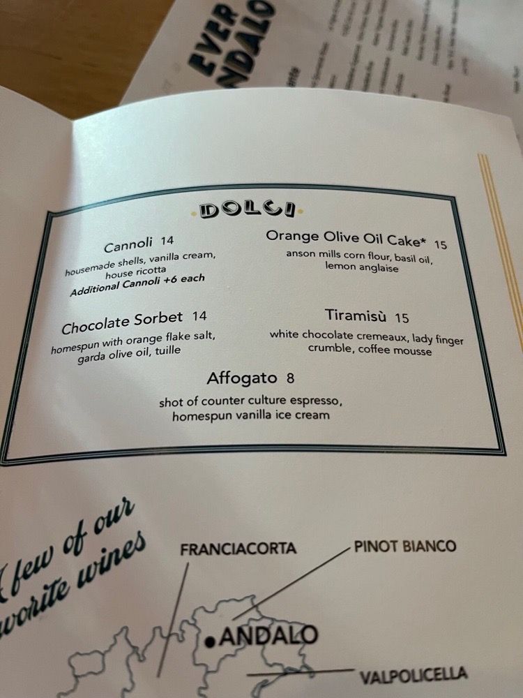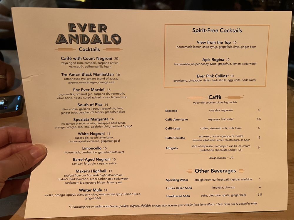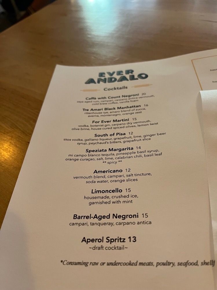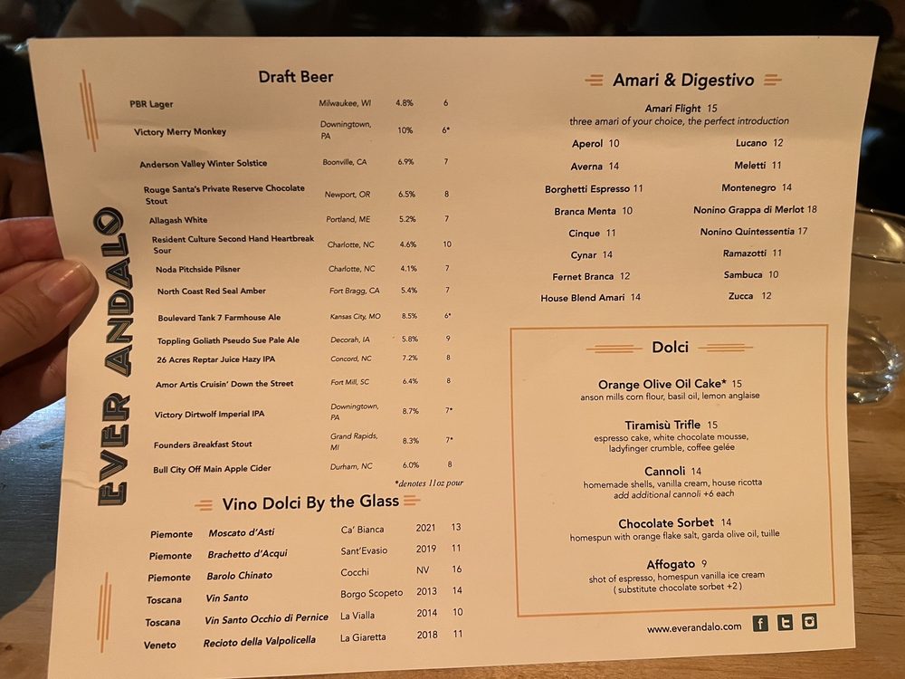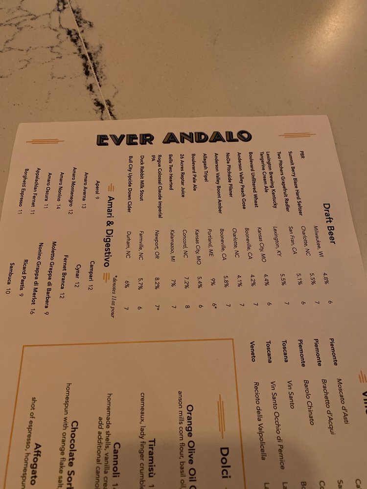 Introducing the menu at Ever Andalo, a women-owned restaurant in Charlotte, NC, known for its intimate and classy ambiance. Open to all, Ever Andalo offers a variety of dishes including Pescatarian options and unique creations like the cheese cloud, Calabrian Chili Pappardelle, and marinated white anchovies. Customers rave about the fresh burrata with orange marmalade and the exquisite cocktails. The attentive waitstaff, including server Nick, enhances the dining experience with personalized recommendations and friendly service. Start off with shared plates like fried whole artichokes and grilled octopus before diving into flavorful entrees like chicken piccata. Reservations are recommended, with a small fee per person, but the exceptional food and ambiance make Ever Andalo a must-visit for a special night out.